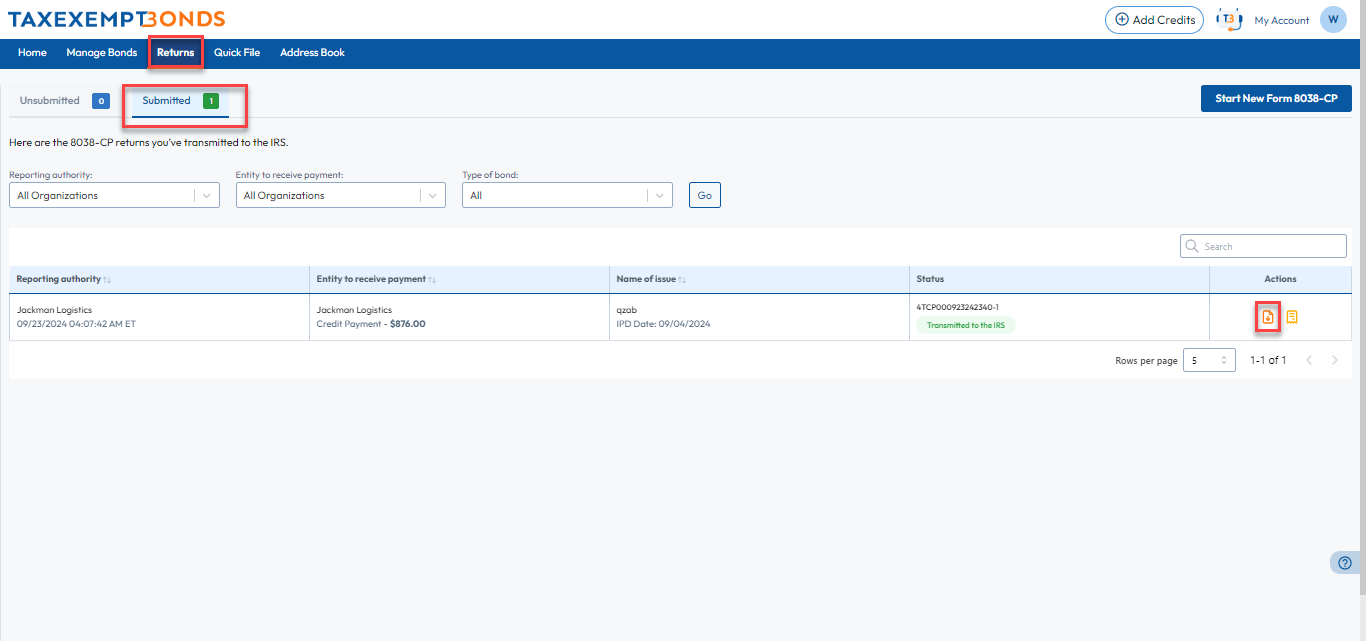 Step 2: In the ‘Submitted’ section, you can download and view your 8038-CP form. Use the filters and search function to find the specific form you need.